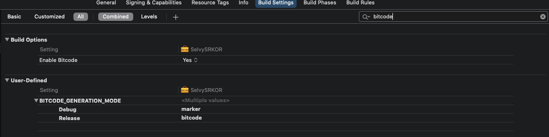 App 빌드 설정에도 User-Defined을 추가해주면 bitcode를 확인하게 되어