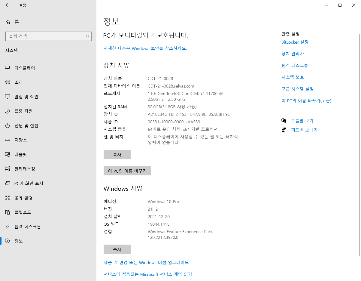 설정 -> 고급 시스템 설정(관련 설정) -> 환경 변수