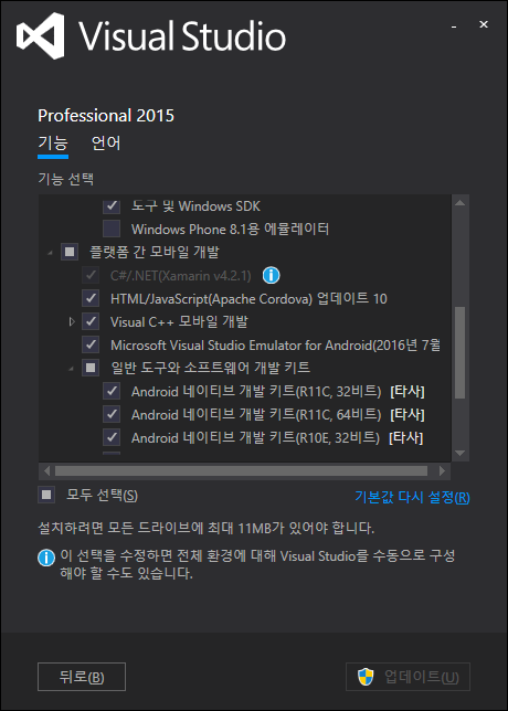 제어판 -> 프로그램 -> 프로그램제거 -> VS2015(마우스 오른쪽) -> 변경 -> 다음 -> 수정 -> 플렛폼 간 모바일 개발 체크 -> 업데이트