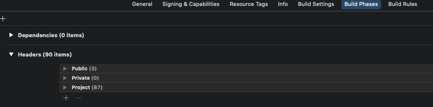 Project->Build Phases->Header public에서 private로 C Header를 이동한다.