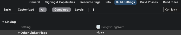 Target Project -> Build Settings -> Linking -> Other Linker Flags 에 -lc++을 추가해 주자
